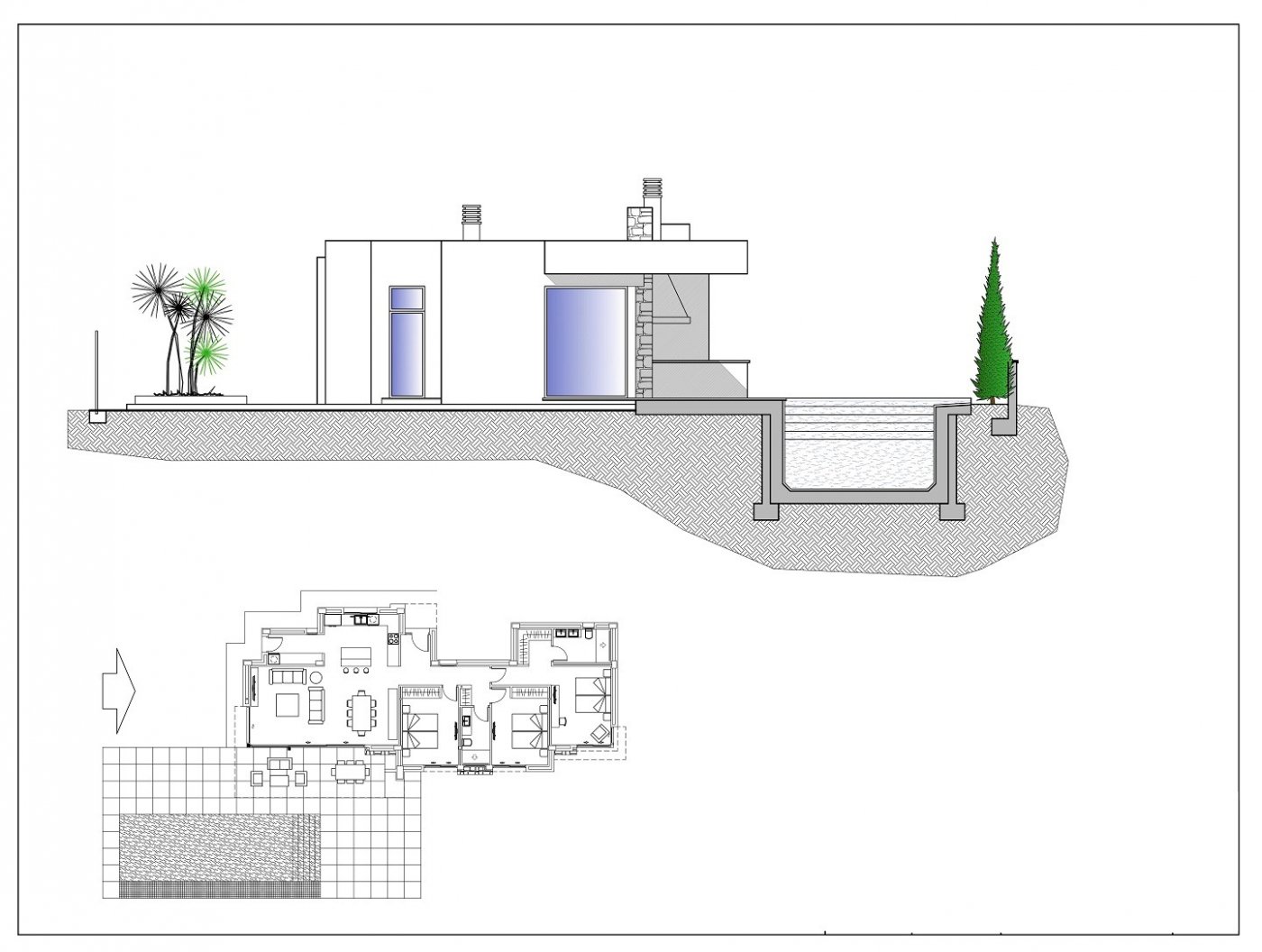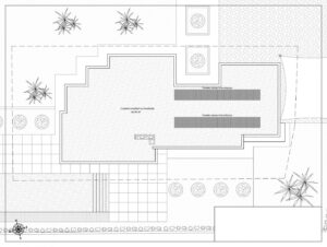 Z głównego wejścia do domu wchodzimy do holu, z którego po lewej stronie mamy dostęp do części dziennej, składającej się z salonu z jadalnią i otwartej kuchni z wyspą oraz miejsca na pralnię. Z salonu mamy dostęp do części zewnętrznej, gdzie mamy zadaszoną strefę ganku z grillem oraz duży taras z basenem o powierzchni 40m2.