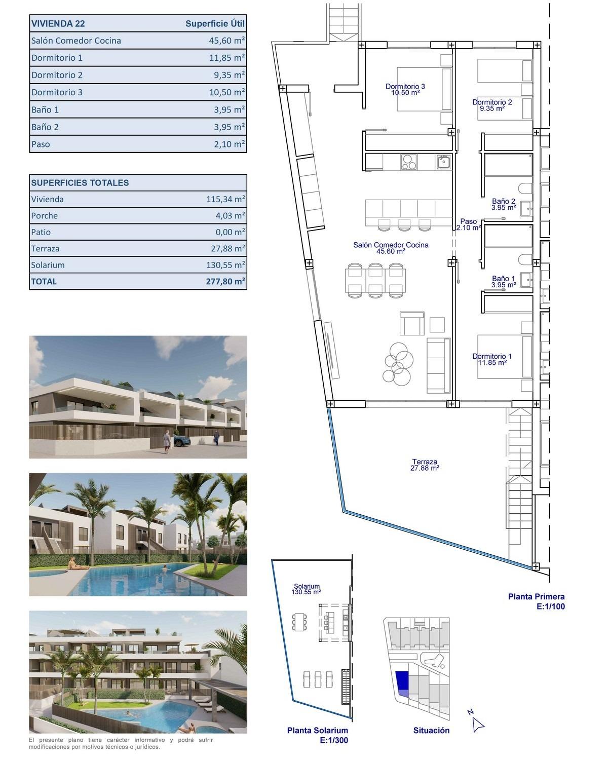 Nowe apartamenty i bungalowy na sprzedaż w Pilar de la Horadada w pobliżu plaży Ekskluzywna inwestycja mieszkaniowa na południowym wybrzeżu Costa Blanca Odkryj ten nowoczesny kompleks mieszkaniowy położony w Pilar de la Horadada, najbardziej na południe wysuniętej miejscowości na wybrzeżu Costa Blanca. Ta butikowa inwestycja oferuje wybór nowoczesnych apartamentów i bungalowów zaprojektowanych tak, aby łączyć komfort, funkcjonalność i śródziemnomorski styl życia. Projekt składa się z zaledwie 26 starannie zaprojektowanych domów z 2 lub 3 sypialniami i 2 łazienkami, co czyni go idealnym rozwiązaniem zarówno na stałe miejsce zamieszkania, jak i na wakacje. Kompleks położony jest w spokojnej dzielnicy mieszkalnej, w odległości spacerowej od centrum miasta, gdzie mieszkańcy mogą korzystać z restauracji, kawiarni, supermarketów, lokalnych sklepów i wszystkich niezbędnych usług. Pilar de la Horadada to urocze hiszpańskie miasteczko znane z przyjaznej atmosfery, tętniącej życiem głównej ulicy i pięknych placów. Dzięki doskonałym połączeniom z pobliskimi obszarami przybrzeżnymi i ośrodkami golfowymi jest to popularne miejsce wśród międzynarodowych nabywców poszukujących słońca i wysokiej jakości życia. Apartamenty i bungalowy z prywatnymi przestrzeniami zewnętrznymi Inwestycja oferuje dwa różne typy nieruchomości, dostosowane do różnych stylów życia. Kompleks obejmuje 16 nowoczesnych apartamentów. Nabywcy mogą wybierać między lokalami na parterze z prywatnymi ogrodami, apartamentami na środkowych piętrach z przestronnymi tarasami lub penthouse'ami z prywatnymi tarasami i solarium na dachu. Dostępnych jest również 10 bungalowów. Bungalowy na parterze mają prywatne ogrody i parking na terenie działki, natomiast bungalowy na najwyższym piętrze oferują tarasy i prywatne solaria. Za dodatkową opłatą dostępne są opcjonalne miejsca parkingowe i schowki w podziemiach. Wszystkie domy zostały zaprojektowane z jasnymi wnętrzami, otwartymi układami i komfortowymi częściami dziennymi, które w naturalny sposób przechodzą w przestrzenie zewnętrzne. Wysokiej jakości konstrukcja i nowoczesne wyposażenie Domy są zbudowane z wysokiej jakości materiałów i wyposażone w nowoczesne systemy, aby zapewnić komfort i energooszczędność przez cały rok. Umeblowane kuchnie W pełni wyposażone łazienki z kabinami prysznicowymi i ogrzewaniem podłogowym Energooszczędny aerotermiczny system ciepłej wody Instalacja przygotowana do montażu klimatyzacji kanałowej Mieszkańcy mogą również korzystać ze wspólnego basenu otoczonego ogrodami krajobrazowymi i miejscami do opalania, tworząc relaksujące środowisko, w którym można cieszyć się śródziemnomorskim klimatem. Doskonała lokalizacja w pobliżu plaż i pól golfowych Osiedle cieszy się strategiczną lokalizacją w pobliżu najlepszych plaż i pól golfowych w regionie. Plaża Torre de la Horadada 3 km Plaża Mil Palmeras 3 km Lo Romero Golf 6 km Międzynarodowe lotnisko Region de Murcia 45 km Lotnisko Alicante Elche 75 km Okolica oferuje również doskonałe połączenia drogowe z pobliskimi nadmorskimi miasteczkami, marinami i obiektami rekreacyjnymi wzdłuż wybrzeża Costa Blanca i Costa Calida. Znajdź swój nowy dom w Pilar de la Horadada Ten atrakcyjny, nowo wybudowany kompleks mieszkaniowy oferuje nowoczesne domy, wysokiej jakości wykończenie i fantastyczną lokalizację w pobliżu plaży. Skontaktuj się z nami już dziś, aby uzyskać więcej informacji lub umówić się na wizytę i zabezpieczyć swoją nową nieruchomość na wybrzeżu Costa Blanca.