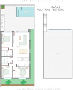 Wille zbudowane na 1 piętrze i składa się z 3 sypialni, 2 łazienki, kuchnia na otwartym planie, salon z otwartym widokiem na taras, solarium, prywatny ogród z basenem.